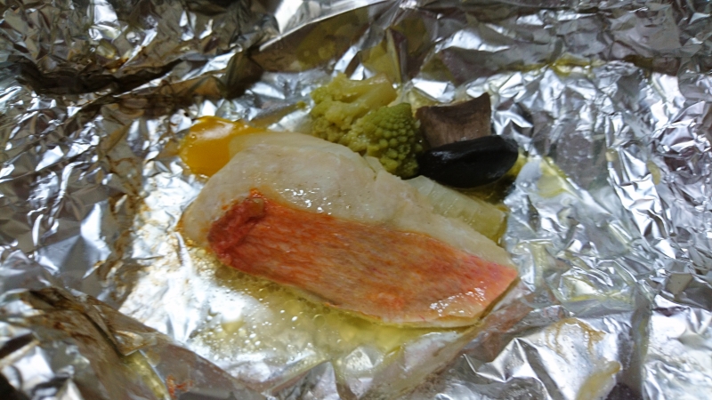 包み焼のアルミホイルを開くと、食欲をそそる香りと共に、金目鯛と彩り野菜が姿を見せます。金目鯛の旨みが染み出て野菜にも染みわたり、優しい味が口の中に広がります。