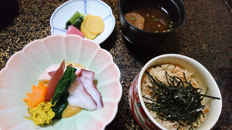 酢物を終え、大体のおかずが出そろうと、お食事が出てきます。秋鮭としめじの炊込み御飯で、おかずがなくても箸が進むほど、しっかりと味が染み込んでいます。