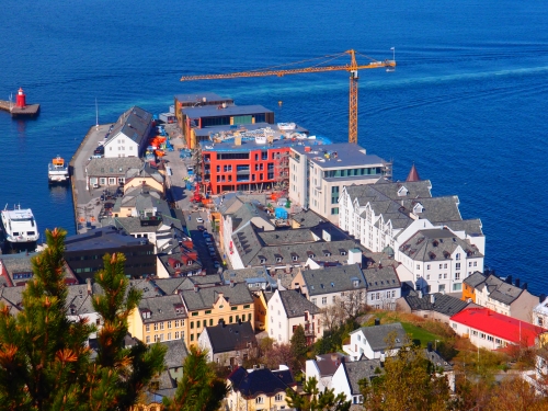 また、この素敵な街やその先のフィヨルドを一望できるビュースポットもお勧め。オーレスン中心部から東方面にあるアクスラ(Aksla)という小高い山。中心部から隣の島へ向かう短い橋(歩いてすぐ)を渡り、タウンパーク内の階段を上った頂上にあります。歩いても行けますし、車でもOK!(少し回り道になりますが、10分くらいで着きます。)街中も美しいですが、高い場所から見渡す街並みは、また絶景ですね!