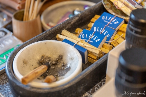 写真:Mayumi Iwasaki浄化作用があると言われる香木パロサントもロゴ入りのマッチ付。アロマテラピー効果も。