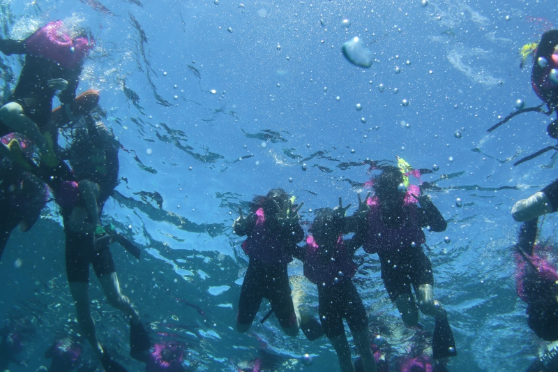 その間、学級委員長(インストラクター)は、いろんな話を聞かせてくれます。全てが、ためになる話で、特に、海の中ではどのようにすれば良いのかという話は、自分の命を守るためにも大事!救命胴衣の付け方、シュノーケルの付け方、フィンの動かし方などは、しっかり聞いておいてくださいね。