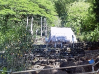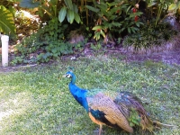 写真:トラベルライター ワイメアバレー入り口看板 |  写真:トラベルライター 駐車場近くにある復元されたヘイアウ(神殿) |  写真:トラベルライター 野放しされている孔雀 |