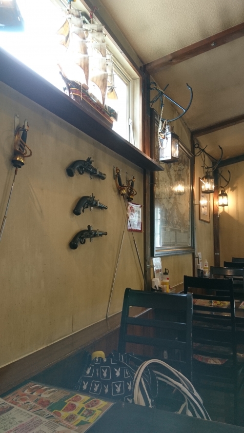 天井からは木造の船や碇(いかり)型の電気が吊り下げられ、宝島に向けて進行方向を定めるかのような舵や、ピストル、剣、宝地図などが飾られていて、お店の名前にぴったりな雰囲気です。