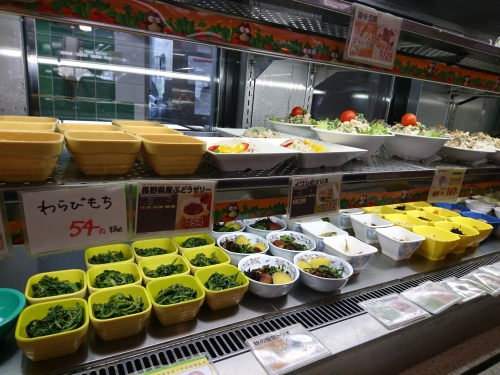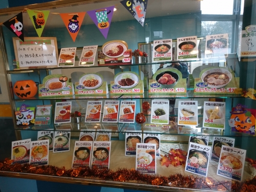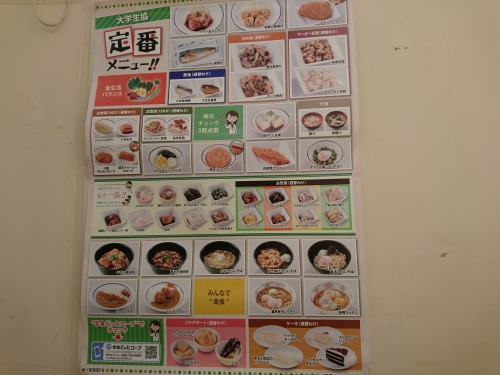 階段の途中や食堂の前には、定番メニューや、期間限定メニューなどの貼り紙が掲示されており、食堂内にも様々なメニューや単品のおかずが並んでいます。