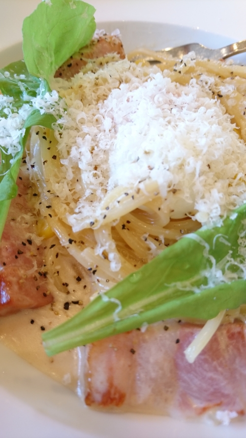 チーズは好きなだけ!厚切りベーコンと温泉卵のカルボナーラ