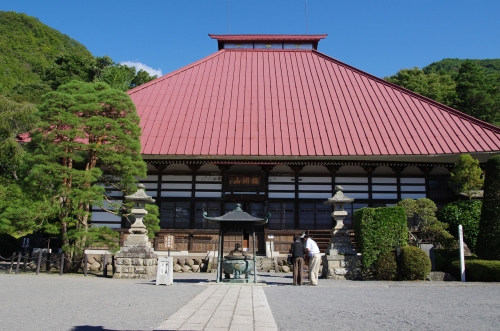 岩松院は、曹洞宗の寺院で、境内には豊臣秀吉の重臣として戦国時代に名を馳せた福島正則の霊廟があります。岩松院の見どころは、本堂中央の天井画で、21畳分もの鳳凰図。葛飾北斎が88歳から89歳にかけて描いたとされており、どこから見てもこちらを見据えているように見えることから、八方睨みの鳳凰ともいわれています。また俳人・小林一茶の句も有名です。1816年の4月にこの寺を訪れ、オス蛙たちがメス蛙を取り合っている様子を見て、「痩せかえる 負けるな一茶 これにあり」という句が詠まれました。