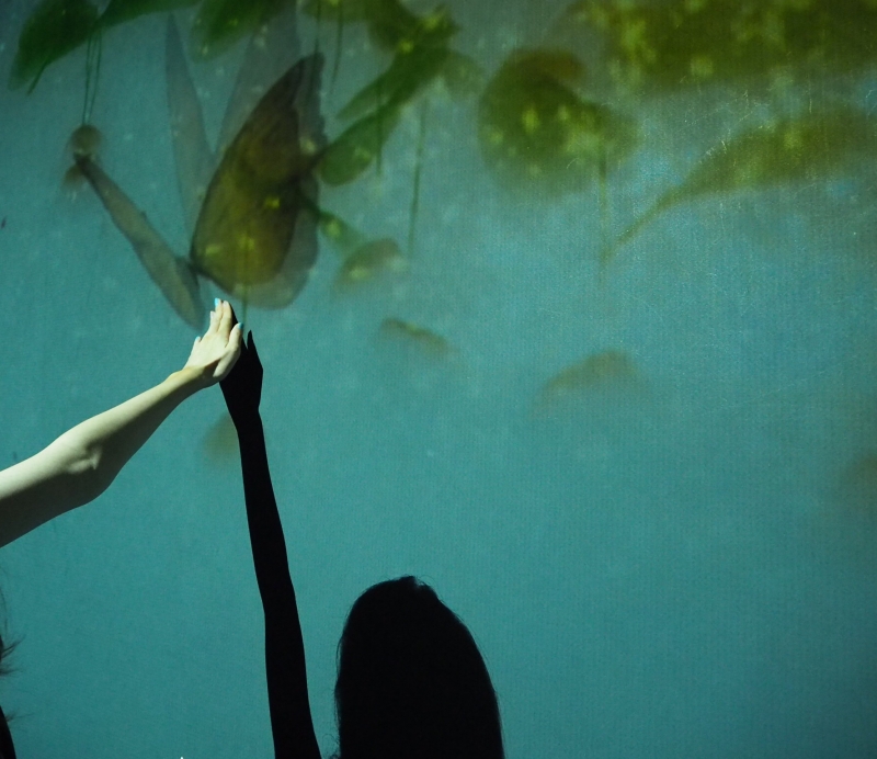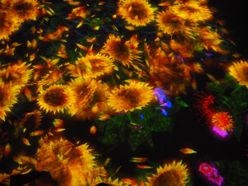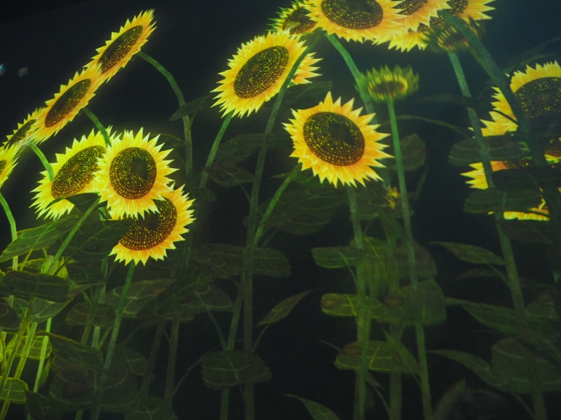 花見台のエリアでは、様々な花や漢字が一文字づつパラパラと降ってきたりします。例えば「月」という漢字に触ると、月の映像が壁一面に広がるんだとか。筆者が訪れた際は、向日葵が壁一面に広がっており、また、蝶の映像を見ることができました。