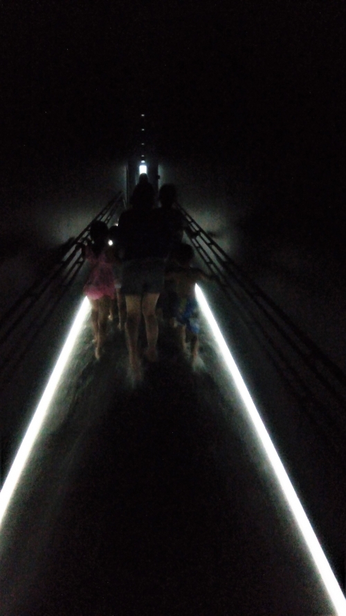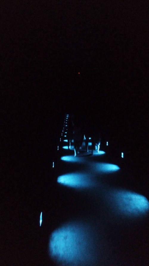 ほの暗い通路を進むと、いきなり水が流れる坂道にさしかかります。暗いので状況が分からないまま、流れる水の感覚を足裏で受け止めつつ前進し、子どもたちはキャーキャー大盛り上がり!出だしから、非日常に突然放り込まれます。ちなみに濡れた脚を拭くためのタオルは、会場内に用意されていますのでご安心を。