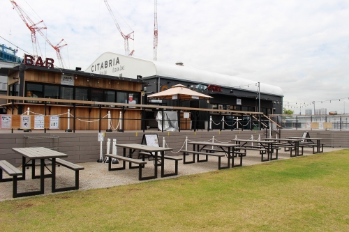 こちらのデッキ付近には、レストラン「CITABRIA BAYPARK Grill & Bar(サイタブリア ベイパーク グリル アンド バー)」があり、屋外のテラス席で窯焼きピッツァやグリルメニューをいただくことができます。特に魚介類のメニューは、近くの豊洲市場から直送された厳選素材を用いており、絶品!コーヒーはもちろんのこと、ビールやシャンパンなどのアルコールも豊富に揃っていますので、散策の小休憩にぴったりです。