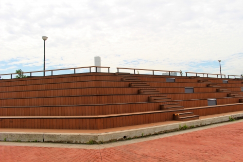 「がすてなーに」を通りすぎて晴海大橋の下をくぐると、階段状になった展望デッキが現れます。このデザインのデッキは豊洲ぐるり公園のあちこちに設置されており、お天気のいい日は寝転んでくつろぐ人や、楽器演奏の練習をしている人の姿もよく見かけます。デッキからは、湾岸エリアの高層マンション群が一望!
