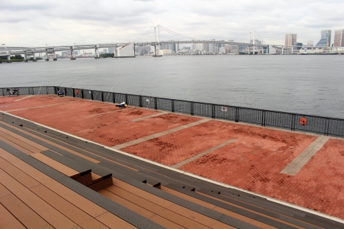 この先端部分にも、もちろん階段状のデッキが備えられています。デッキにゆっくり腰かけてレインボーブリッジを眺めるひとときは、至福の極み。時間の許す限りのんびり過ごしたいものです。ちなみに、夕暮れから夜にかけてレインボーブリッジがライトアップされる時間帯は、最高のデートスポットになりますよ♡
