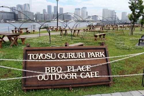 豊洲ぐるり公園のメイン広場には、手ぶらでバーベキューができる「BBQ PLACE(バーベキュープレイス)」が営業しています。事前予約をしておけば、食材や食器などの備品はすべて用意してもらえるので、いつでも家族でバーベキューが楽しめます。キャンプ場などの山でなく、たまには海を眺めながらのバーベキューもオツなもの。