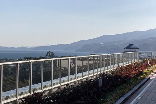 タワー棟の14階には展望庭園があり、通常は10:00~18:00まで無料で足湯を楽しめます。こちらの足湯は箱根湯本の温泉を使っており、足湯に浸かりながら、小田原の街並みや相模湾を臨む事ができます。なんとその眺望は、小田原城の天守閣展望デッキとほぼ同じだそうです。