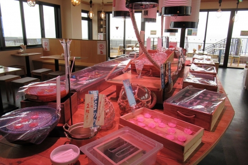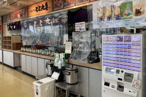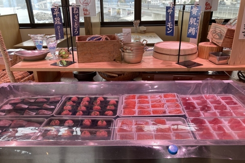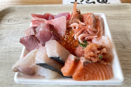 施設3階にあるお店では、丼ぶりのご飯に自分で好きなお刺身を好きなだけ乗せて作る、海鮮乗っけ丼を作る事ができます。