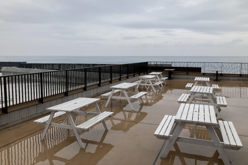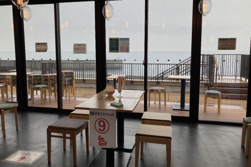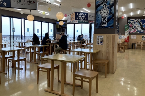 施設2階は、大漁旗のある廊下を抜けるとフードコートがあり、海鮮丼や海鮮ラーメン、定食、デザートなどが楽しめます。席は屋外のテラス席もあり、相模湾を眺めながら食事を楽しむ事ができます。