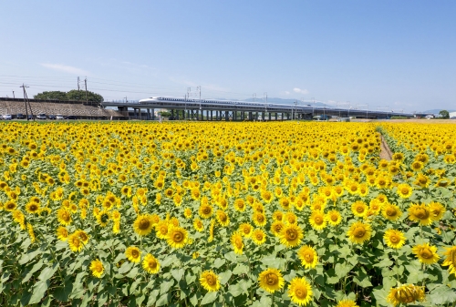 休耕田を有効利用する取り組みの一貫として、毎年場所を変えてひまわりを植栽しています。場所や時間帯によっては、ひまわりと東海道新幹線とのコラボが楽しめるのも人気の理由のひとつ。2018年、2019年とひまわり畑の会場となった平町では、約2.7haの土地に12万本ほどのひまわりが咲き誇りました。