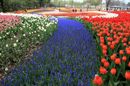 愛知県、岐阜県、三重県にわたる日本最大の国営公園「国営木曽三川公園」内にある公園。木曽三川を一望できる展望タワーがシンボルとなっています。4月上旬〜4月中旬頃には、色とりどりのチューリップと紫色のムスカリで「木曽三川の流れ」をイメージしたデザインの3,800㎡の大花壇が登場。そして8月中旬~9月下旬にはキバナコスモス、9月下旬~10月中旬には50万本のコスモスが大花壇を彩ります。