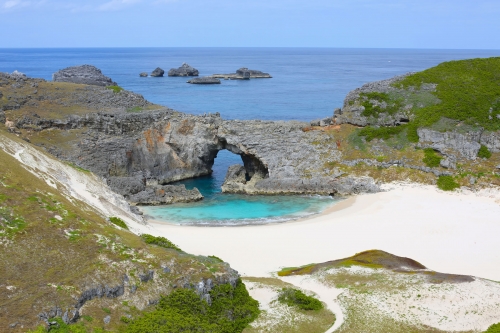 小笠原諸島、父島を訪れたのなら、ガイドツアーに参加して、南島に上陸しましょう。ここは絵に描いたような南の国の楽園的風景。美しいだけではなく、地質、生物学的にも貴重な事例が数多く見られるエリアです。「沈水カルスト地形」と呼ばれる石灰岩特有の特殊な地形に、「ドリーネ」というくぼ地や「ラピエ」という尖った石炭岩が見られる小さな無人島です。島内の砂丘には約1000年前に絶滅した「ヒロベソカタマイマイ」の半化石が数多く見られます。自然保護のために、1日に上陸できる人の数は100人。毎年11月〜2月は植生回復のための立入り禁止期間となります。是非、事前にガイドツアーに申し込んで、地球を体感してください。