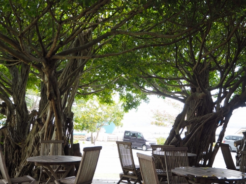 定期船、おがさわら丸が発着する二見港。待合室から道路を挟んだ向かいに、ハートロックカフェはあります。宿泊施設「ハートロックビレッジ」に併設されたこちらのカフェでは、島で獲れたオナガザメのサメバーガーという珍しい名物も。また、世界最北端で栽培されているのではないか?と言われている、とっても貴重な小笠原コーヒーもいただけるチャンスがあります(数量限定)。ガジュマルの木に囲まれた空間で、ゆったりとした時間を過ごしてみてください。
