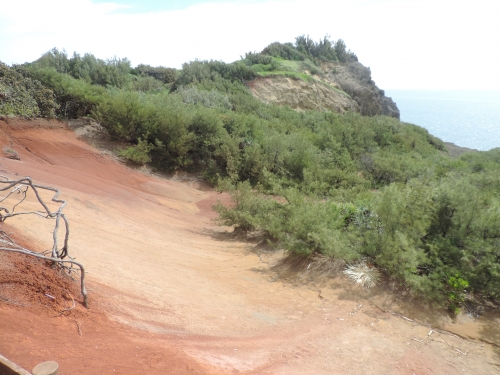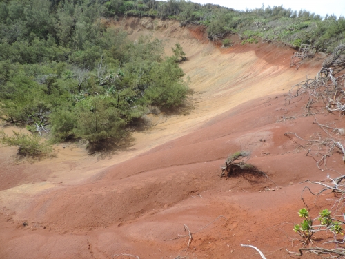 後術する「都道最南端」から島の最南端「小富士」へと続く歩道の途中にある景勝地です。土に含まれる鉄やアルミニウムが酸化してできた赤茶色の土が、文字通りすり鉢状に広がっています。