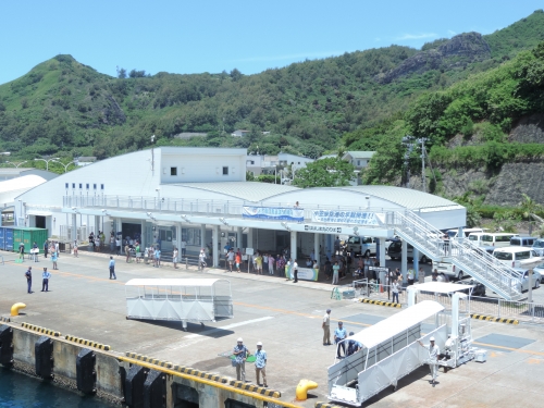 東京の竹芝埠頭を出港して24時間、おがさわら丸が到着する小笠原諸島の玄関です。旅客ターミナルには多くの島民の皆さんがお迎えに来ています。また、帰りの船が出港する際のお見送りは感動的です。