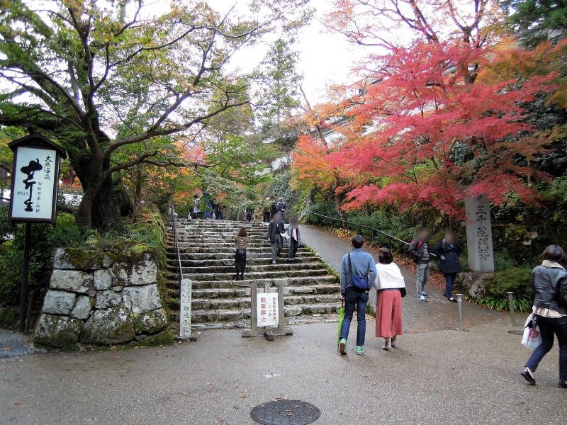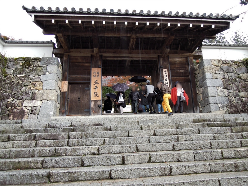 御殿門は、三千院の玄関口にある門です。周囲は高い石垣で囲まれているのが特徴で、これは滋賀県坂本の穴太衆(あのうしゅう)という有名な石材職人が積み上げたものとされています。門跡寺院らしい重厚な石垣を眺めてください。