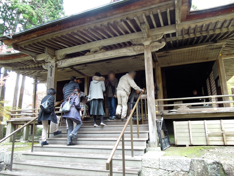 こちらには阿弥陀三尊像が祀られていますが、建物に対して大きいので、屋根を船底型にすることにより堂内に収めているそうです。その屋根には、天女や菩薩が極楽浄土に舞う姿が極彩色で描かれており、極楽浄土の世界をそのままに表しています。見た目は簡素ですが、三千院の歴史上、とても重要な建造物です。