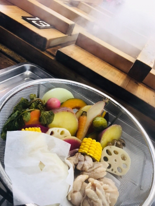 海地獄から車で約5分。鉄輪温泉街の地獄蒸し専用施設です。予約不要で、常に多くの人で賑わっています。券売機で好きな材料を買い、自分で地獄蒸しを体験できる貴重なスポットです。