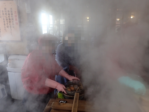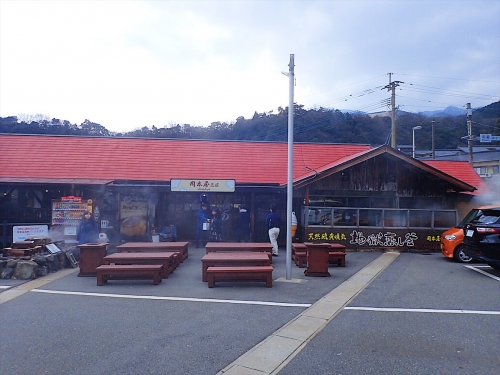 血の池地獄から車で10分。こちらは明礬地域にある岡本屋旅館の売店です。温泉の噴気で蒸しあげ、温泉成分が染みた地獄蒸しプリン(260円)はとろける美味しさです。