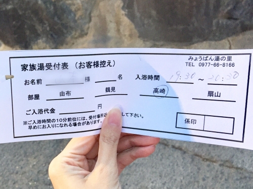 家族湯を利用する場合は、先ず「温泉蒸し 湯庵」へ行き、その旨を伝えます。用紙に必要事項を記入し料金を支払い、お客様控えを貰います。予約時間5分前にもう一度「温泉蒸し 湯庵」へ行き、説明を受けたのち、予約した家族湯の棟へ向かい入浴します。