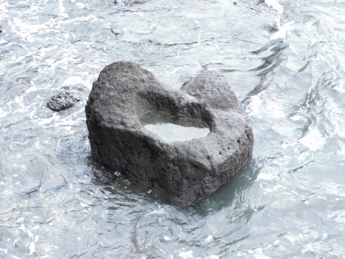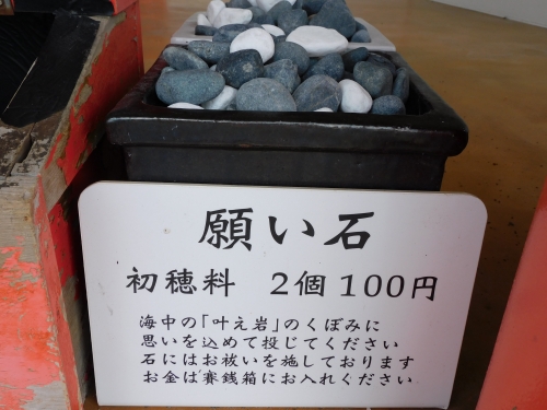 粟嶋公園の駐車場に車を止め、公園の中を通り抜けて階段を降りた先にあるお社。海に突き出た岩窟の中に本殿があり、縁結びの神様として多くの参拝者が訪れています。お社の前の海中にある岩のくぼみに目掛けて石を投げる願い石や、愛鍵と呼ばれるハート型の南京錠に願いごとを記すなど、珍しい願掛けもできます。