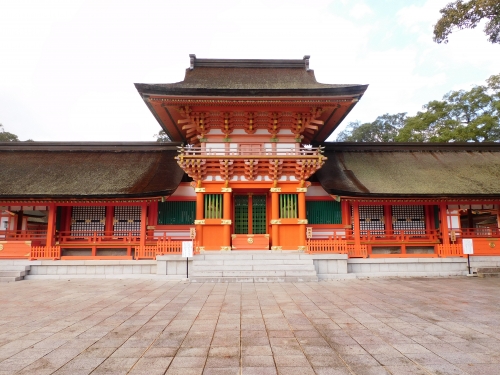 全国に約44,000社あると言われる「八幡社」の総本宮で、全国に数多くある神社の中で伊勢神宮に次いで2番目に格式の高いお社です。茅葺の屋根と朱色の柱、白壁のコントラストが美しい本殿は、国宝に指定されています。