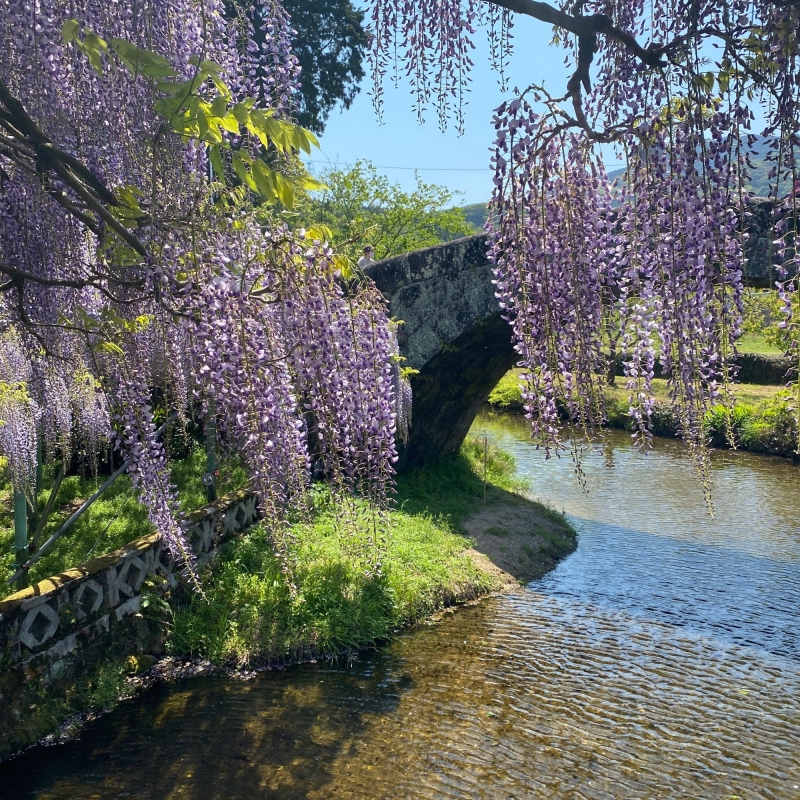 大分県にある「西寒多神社」は、県内では「宇佐神宮」につぐ尊崇をあつめる神社です。樹齢数百年の一本の木から咲き誇る美しい藤が有名で、花房は長いものになると1mを超えるそう。例年4月下旬から5月上旬にかけて見頃を迎えます。藤棚のすぐ隣には、寒田川にかかるアーチ型の「萬年橋」があり、こちらは大分県の有形文化財に指定されています。