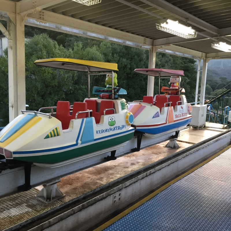 上の写真の「ポップンスマイル」は、キティちゃんはじめサンリオキャラクターのゴンドラに乗ってゆっくり回るアトラクションで、0歳児でも乗ることができます。