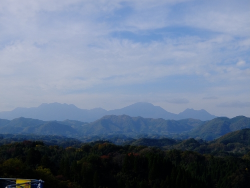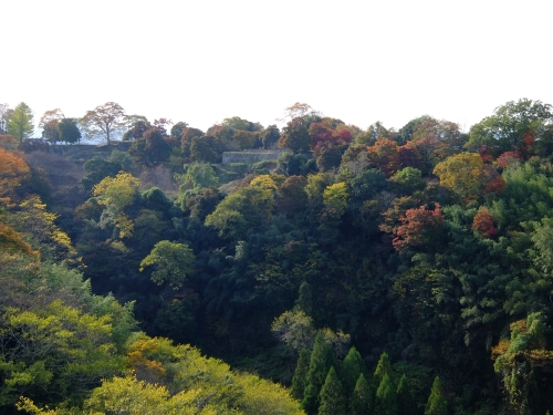 また、ここからは対面の山の合間に普請方跡や家老屋敷跡の石垣や、遠くにそびえる九重連山も見ることができ、景観も楽しめるスポットです。