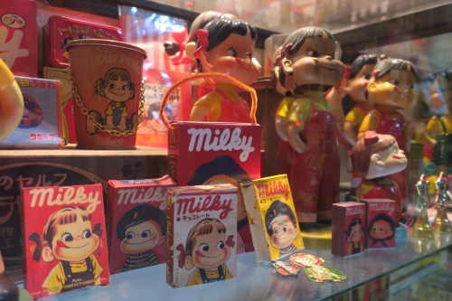 昭和30年代に子供時代を過ごした人にはたまらない、懐かしいおもちゃがぎっしり。ペコちゃんやグリコのおまけ、ゲーム機など、あらゆるおもちゃが展示されています。