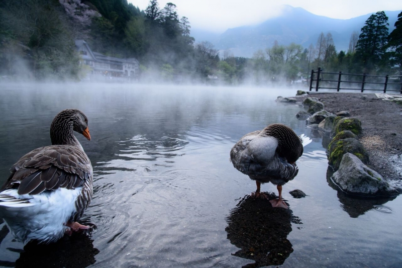 金鱗湖は周囲400メートルほどの大きさで、遊歩道も整備されているのでちょっとした散歩にはぴったりです。霧の立ちのぼる湖の周りをゆっくりと回ってみましょう。