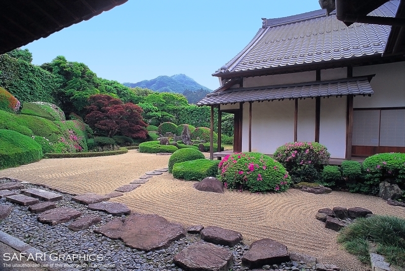 砂紋が海を、サツキの大刈り込みが大海原の波を表現し、その中に鶴島と亀島が配されています。精緻に作り込まれた庭園が人の手によるものであることを思うと、毎日の行き届いた手入れに感嘆するほどの美しさです。
