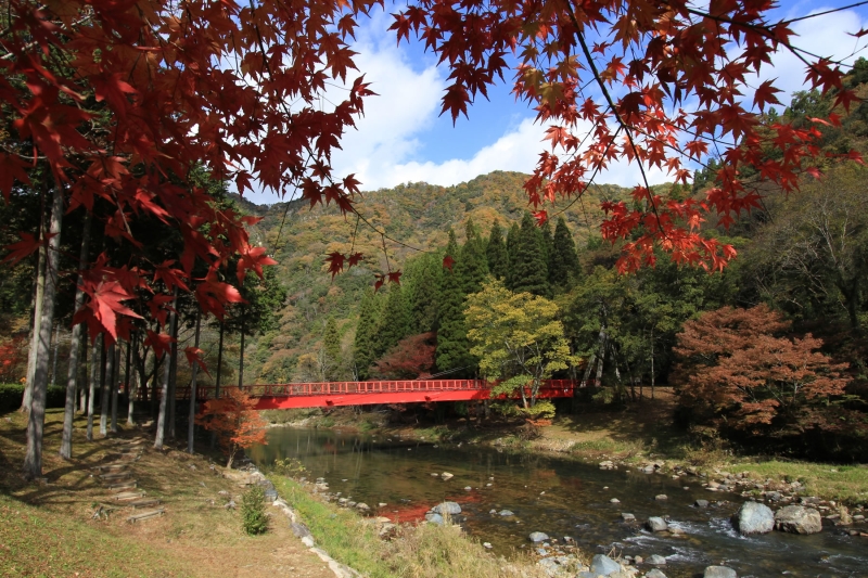 宇甘川沿いに広がる全長約4kmの渓谷。一番の見どころは「石の広場」近くにある「赤橋」の風景で、特に秋は紅葉とのコラボを目当てに多くの人が訪れます。紅葉の見ごろに合わせて、夜にはライトアップも。美しい風景に心癒されながらお散歩してみて。