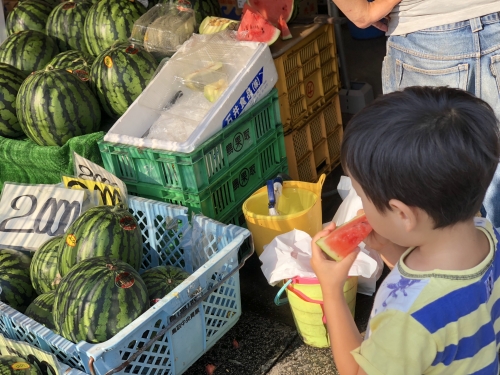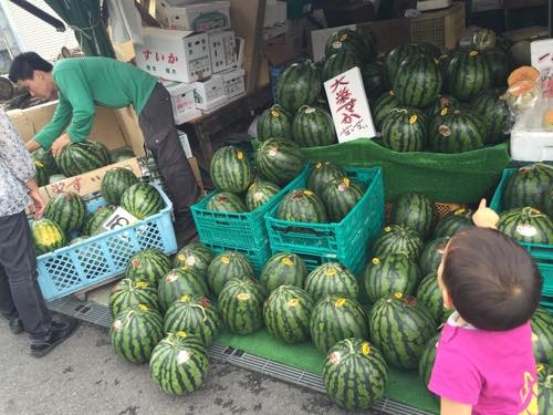 夏は 大栄スイカ がゴロゴロと並べられていて、味見もたっぷりいただけます。大玉で2,000円ほど。甘くて美味しい!こんなスイカが1玉2,000円で購入できるなんてびっくりです。