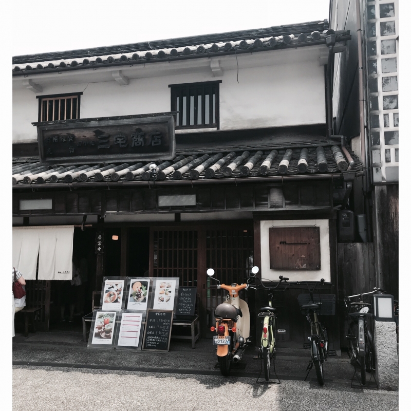 江戸時代後期に建てられた町家を改装したカフェ。戦前より日用雑貨・荒物屋だった屋号をそのまま受け継いでいます。店内ではランチの三宅カレーや季節により内容が異なるパフェなどがいただけるほか、マスキングテープなどの販売もしており、買い物だけの利用もできます。