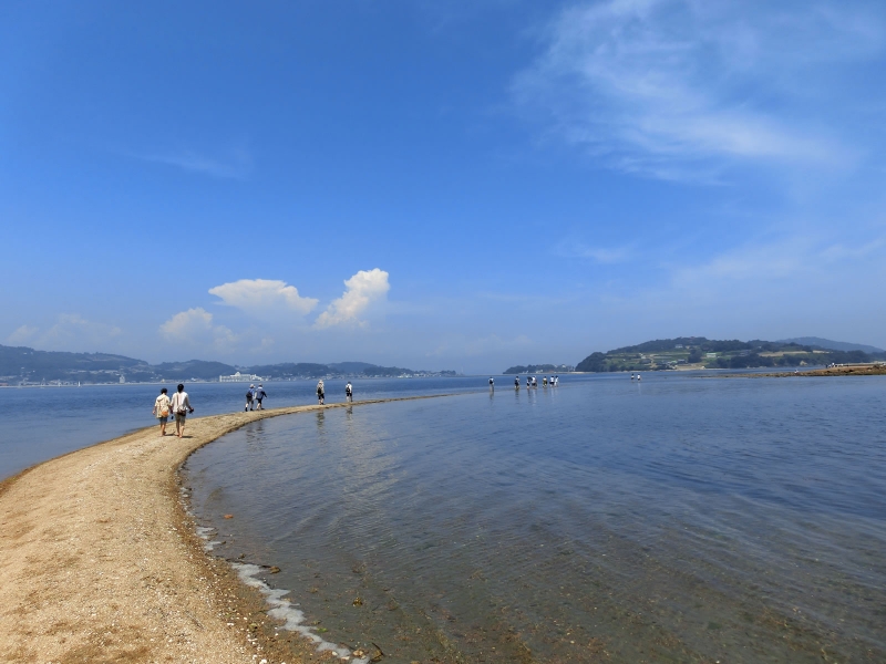 ”日本のエーゲ海”と呼ばれる牛窓の海に現れる幻想的な砂の道。黒島、中ノ小島、 端ノ小島の3つの島をつなぐ長さ約800mの弓なりの砂州で、潮が引くと一本の砂の道が浮かび上がり、歩いて渡ることができるというもの。この一本道を歩きながら、クラゲやヒトデなどの海の生き物を観察したり、中ノ小島にあるハート形の天然石「女神の心」を探したりしてみてくださいね。