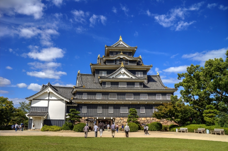 豊臣秀吉の指導をうけて宇喜多秀家が築城し、慶長2年(1597年)に完成。昭和20年(1945年)の空襲で天守閣は焼失しましたが、昭和41年(1966年)に再建されました。外壁に黒漆が塗られており、太陽に照らされると烏の濡れ羽色のように見えるため「烏城(うじょう)」とも呼ばれていました。