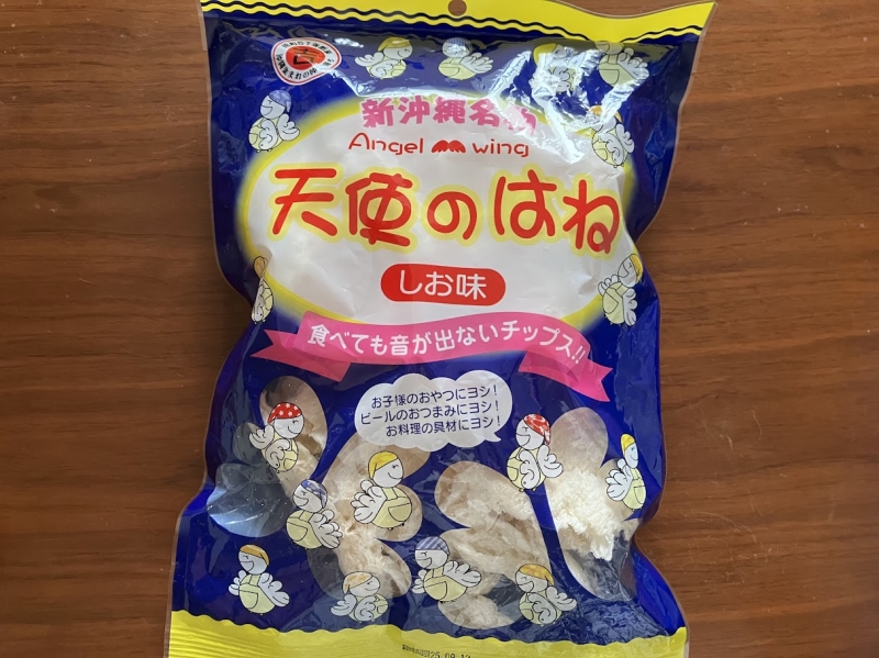 丸吉塩せんべい屋が販売する天使のはねは2007年頃から販売を開始されました。戦後の米軍による占領の影響で、小麦粉が供給されたこともあり、米粉より小麦粉で作った塩せんべい沖縄では定番です。せんべいの型の隙間から生地が漏れて、くっついてしまう部分を取り除いたものがなんとも言えない食感で美味しい、ということで販売してみたところ大人気になったそうです。そのまま食べるだけでなくスープや炒め物にも使えるようで、バリエーションも豊かですね。