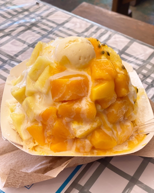 買い物だけでなく、地元産の食材を使用したフードコートもあるので、ランチやおやつタイムに行きましょう。是非、頂きたいのが沖縄産のフルーツをふんだんに使用したかき氷や、揚げたてのサーターアンダギー。かき氷は、たっぷりの量があるので、シェアして頂くのがおすすめ。