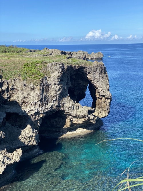 万座毛は、琉球石灰岩の断崖から、象の鼻に似ている奇岩を見ることが出来るんです。美しい芝生の緑と、空と海のブルーのロケーションが待っています。駐車場は無料で、入場料も¥100とリーズナブル。