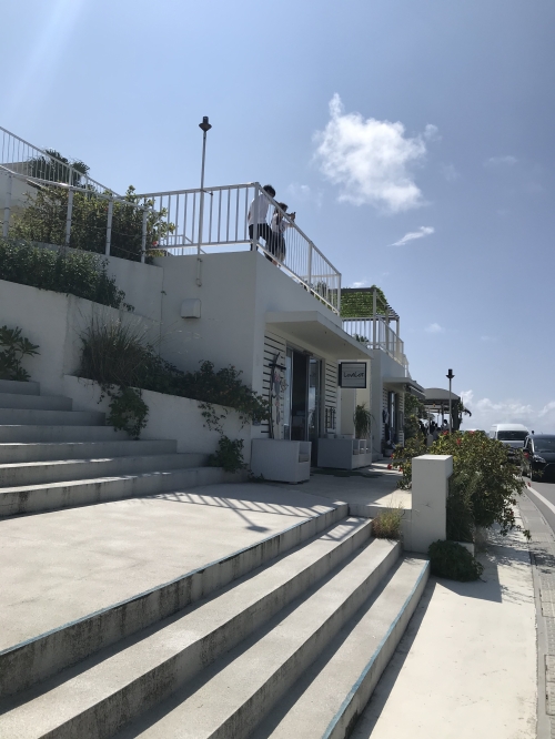 お店から、青い海と空が一望出来るカフェとして大人気。階段を降りて行くと、入口があるんです。なんといっても人気の席は、店内のカウンター席。青い海を見ながら食べるケーキやお茶は、沖縄ならでは。