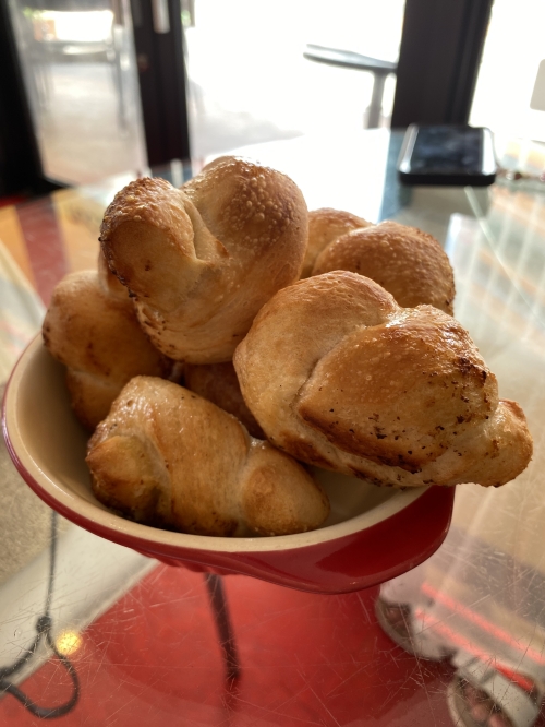 中々頂けるお店が少ないガーリック・ノット(garlic knots)(¥720)も、オーダーしましょう。熱々で、ガーリックが効いたパンは、止まらなくなる美味しさ。どちらも、アメリカで人気のランチ・ドレッシング(ranch dressing ¥50)を付けて頂けば、味変も楽しめるんです。量が多いので、残ったらテイクアウトしましょう。