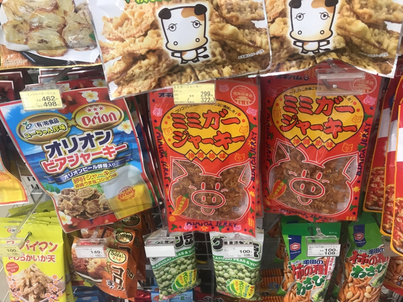 ミミガージャーキーやオリオンのジャーキー、スッパイマンなどの沖縄らしいお酒のおつまみが並んでいます。