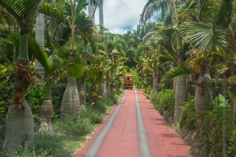 「ナゴパイナップルパーク」は、パイナップルや南国のフルーツを生産しているテーマパーク。広大なパイナップル畑の中を、自動で動くカート「パイナップル号」に乗って移動したり、パーク内に設けられたフォトスポットで記念撮影をしたりと楽しみ方はいろいろ。